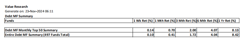 - Funds with above average retuen in all timelines within the list except for one timeline are marked in amber. For the amber rule, if anyone across 1W and 1M return is above average, then both are considered as above average. If both the 1W and 1M return are below average, they together are counted as one timeline.