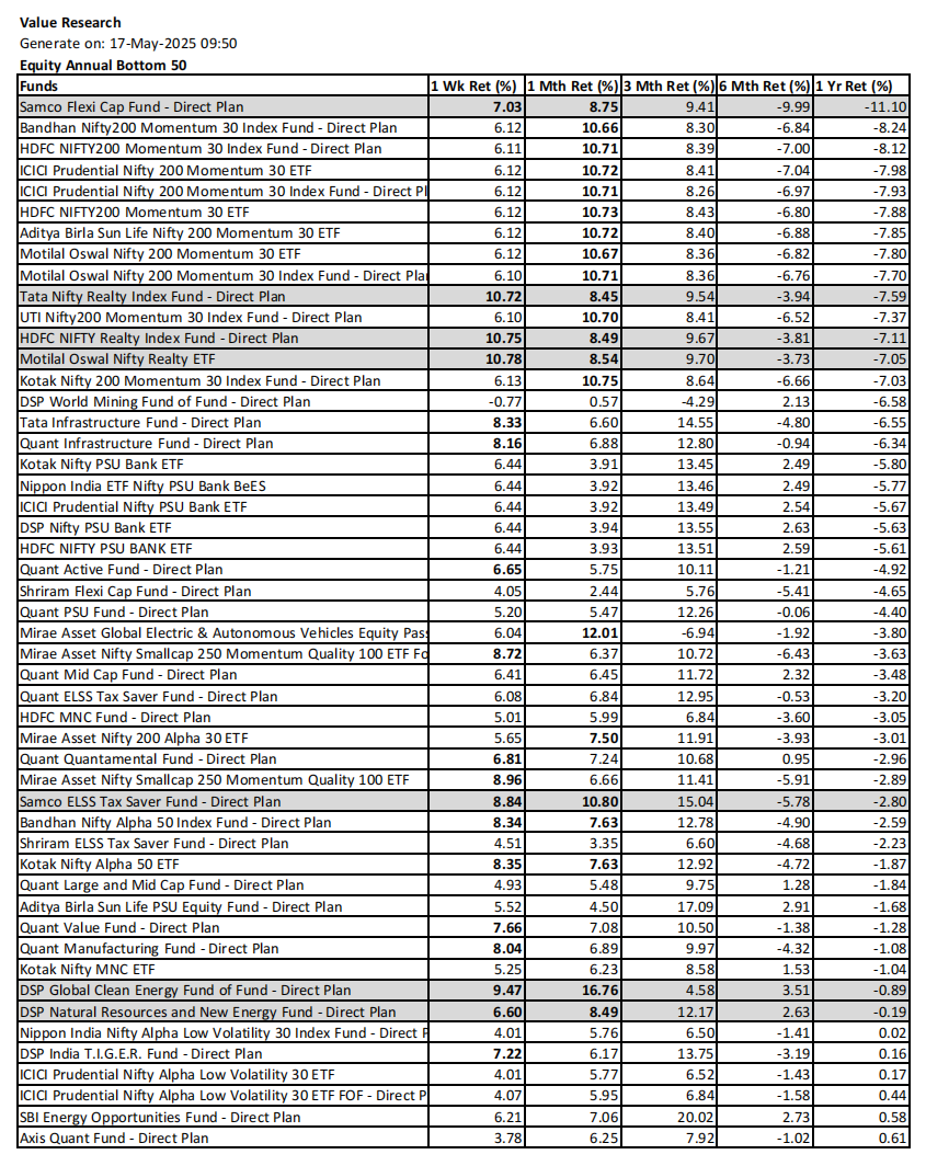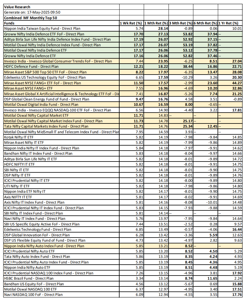 Certain Defence funds, Capital Market ETF funds, Manufacturing Funds, Smallcap Funds from Equity funds dominated the Weekly Top 50 Combined. The PSU Bank Funds came on the top of this weekly list.