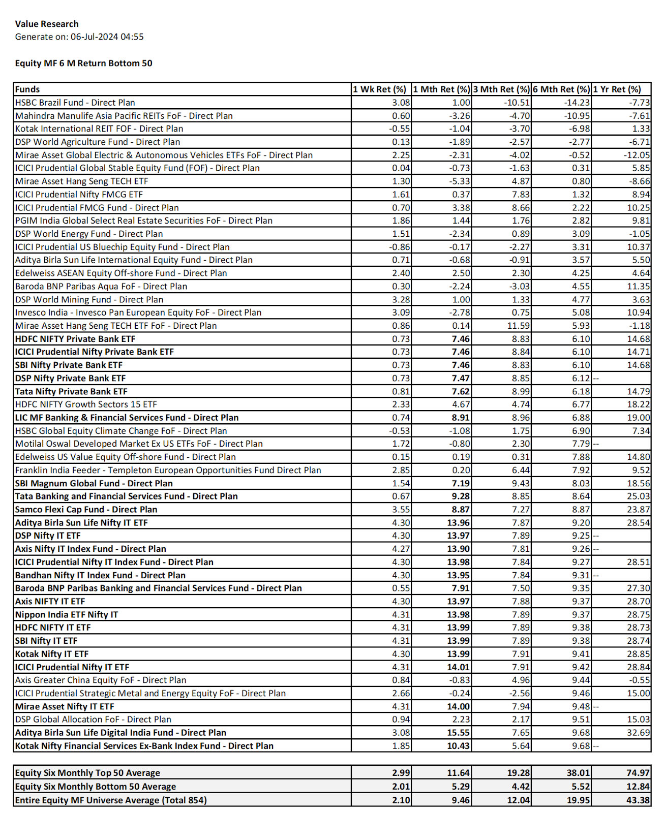 12. Looking at the bottom 50 based on 6M return on the Rest of the funds combined except for Sectoral, Thematic and Intrenational, the ones marked in bold are those giving above average monthly returns, ones holding these can hold longer therefore in hope of further recovery.